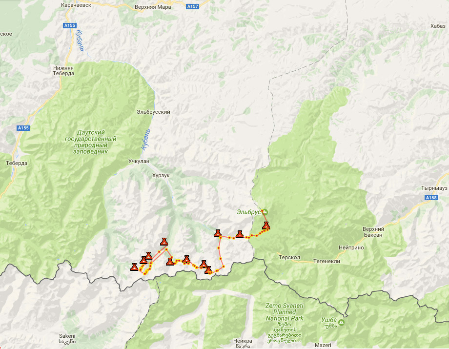 Пройденная нитка маршрута: а/л Узункол - р. Морде - пер. Малая Гвандра (1Б, 3350 м) – пер. Пирамида (2А, 3250 м) – р . Морде – а/л Узункол - р. Кичкинекол – пер. Малый Кичкинекол (1А, 3180 м) – пер. ТБ (1Б, 3352 м) – пер. АКТ (2А, 3441 м) – р. Кичкинекол - р. Уллу-Кам – пер. Хотютау (1Б, 3546 м) – Приют 11 – г. Эльбрус Зап. (2А, 5642 м) - пос. Терскол.