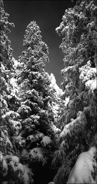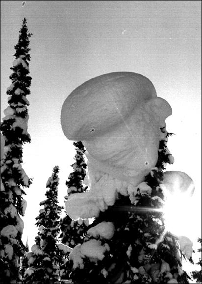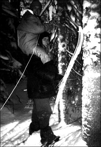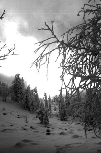 Эдька развивает бешенную пропаганду о пользе здорового образа жизни, и плотные шеренги умных сильно редеют, теперь нас двадцать. Чего, чего, а мозгов у Эдьки точно нет. Делить килограмм колбасы на 9 человек, или на 20, есть по вашему разница или нет? По Эдькиному нет. На запах копченной колбасы с нами отправляется даже покалеченная Ленка, еще бы, да я бы за колбасой босиком по углям побежал, А вы? По пути к хребту мы благополучно переправляемся через три речки, но у самого подножья Эдька все–таки проваливается в воду. Он стягивает штаны, и оставшись в одних трусах (черных в белый горошек), начинает выжимать носки. Ослепительная красота Эдькиных трусов напрочь затмевает мой разум, и я, вновь забывая о фотоаппарате и компрометирующих снимках, торопливо записываю адрес магазина. Дюха где–то по дороге надыбал красный флаг и теперь ходит то стройными шеренгами, то праздничными колонами, скандируя лозунг: "Политех лучше всех!" Все остальные изображают руководство области или района. Эдька, подгоняемый хлюпающей в ботинках водой, вламывается на гору, как слон в посудную лавку. Я следую за ним в кильватерной колоне, нам некогда оглядываться, и мы не видим, как путевые люди идут по гребню. Мы вспарываем ботинками свежий наст, вслед за нами пенятся клубы снежной пыли и остается утрамбованная траншея для тяжелого танка. Через 15 минут вспашки снежной целины Эдька соизволил оглядеться по сторонам и заметил тропинку, уже давно идущую в метре рядом с нами. Соединяемся с основными силами. Погода, что надо! Пурга прямо в лоб, уши рдеют и бьются на ветру, как "Флаги на башнях". Под гул урагана, мы забираемся на перевал «Европа–Азия». Димка, Фил и Мишка быстренько удрали в Европу, и я, надрывая глотку ору: "Домой!!!" Пурга, используя момент, тут же влепила мне в рот гоpу снега. Я замолкаю, пережевываю снег. Проглотив, я снова ору, и снова во рту сугроб. Так повторяется раза три, пока компания гуляк не возвращается в Азию.