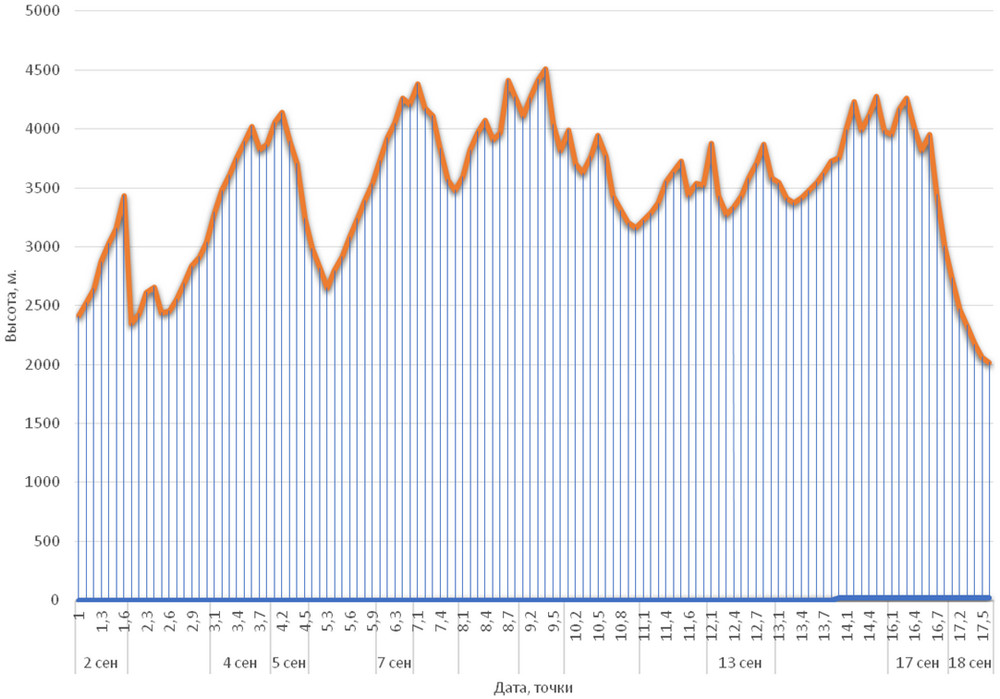13.09.2023 | 12 | р. Атджайло - пер. Кызылбекбель (н/к - 1А 3700) - пер. Карабель (н/к, 4035) - р. Ойбала - второй прав. приток р. Ойбала | 24 |