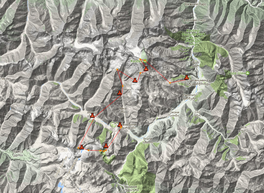 Высокий 1А 3500 м - каньон р. Эсикомодон - р. Терек - село Закагори (рад.) - село Кетриси - село Окрокана - р. Мнаисидон