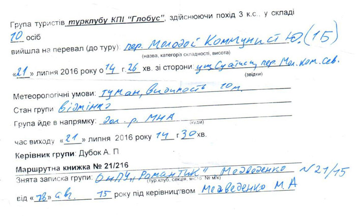 - разведка по левому притоку реки до водопада до высоты 2600 м (рад.) - пер. Молодой Коммунист Южный 1А 3500 м (рад.) -