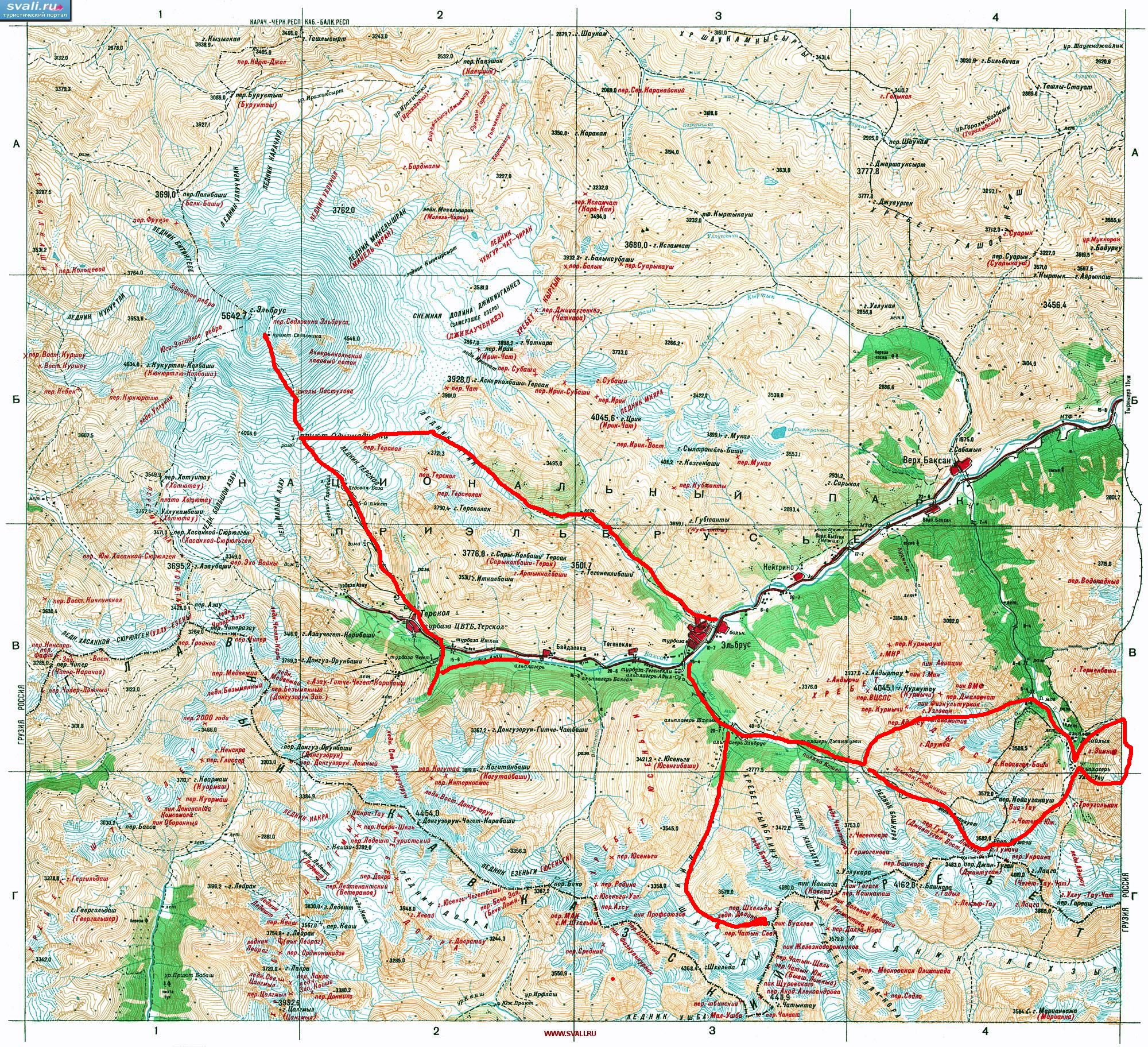 - 2А, 4200 м, лд.) - рад. Седловина Эльбруса (2А, 5200 м, лд.) - р. Баксан - пос. Чегет - рад. "Долина