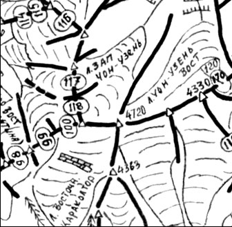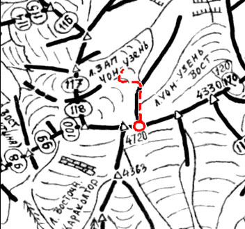 На исправленной карте красным цветом отмечено местонахождение перевала "Одесских политехников" и путь спуска с перевала на ледник Чон-Узень.