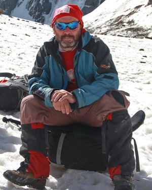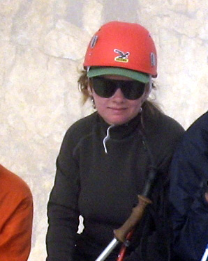 После завтрака дюльферяем вниз в кошках. Дима последний, снял перила и спускался по подмёрзшему снегу с двумя ледорубами. Всего вниз было 5 верёвок по снегу разной крутизны (до 50º), 2 станции - на крючьях, потом на ледорубе. С очередной верёвки Палыч долго кричал Кате и Даше внизу, но они из-за скал плохо слышали. Внизу снег глубокий и мягкий. Катя проваливалась по пояс в узкий бергшрунд (или бергштрудель, как его обозвала Даша).