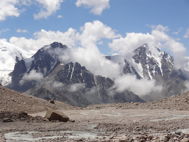 Вышли в 8.30. Подъём на перевал идёт по осыпному склону в градусов 30. Много живых осыпей. За ходку поднялись на широкую седловину перевала. Опять стаявший ледник. Идём по сыртам. Высота около 4000 м. На юго-востоке отлично виден Акшийрак и рудник Кумтор. За три ходки пересекли седловину и начали спуск в долину реки Иттиш. Склон градусов 25. Спустились за 30 минут и пошли на север вдоль правого борта долины Иттиш. Много болот, сазов, идём выше, по осыпям. Тропы нет. За три ходки подошли к левому притоку реки Иттиш. Нам туда. Это путь на перевал ТК "Меридиан" (2А), я сделал его первопрохождение в 2007 году с севера на юг, теперь идем юга на север. Встали в широкой долине у языка ледника перед моренными валами.
