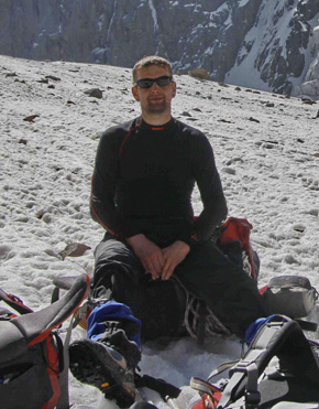 Вышли в 7.30. Проскреблись по правому борту через моренные валы. Много взлётов и прочих прелестей (1 час). Затем вышли на открытый ледник. За 1,5 часа дошли до широкой седловины перевала. Фирн начал проваливаться, прижались в левому борту. Кругом очень красивые вершины. Крутизна ледника 15-20 градусов. На широкой седловине тур, в нем наша записка с предыдущего раза. На "аэродроме" очень глубокий снег, проваливаемся местами по пояс. Связались, сразу вниз идут трещины. Подошли к зоне перегиба. Тут всё очень сильно изорвано, громадные трещины. Петляем туда-сюда, практически почти от одной стороны ледника до другой. К боковым скалам приближаться нельзя, с них постоянно идут камнепады. Пережили несколько "волнующих" моментов, переходя-переползая узкие ледовые мостики. При обвале "мостика" наберешь метров 5 полета, так как все они идут "наискосок" и буквально по ширине ботинок. Страховка через ледобуры. Через 300 метров вышли к снежно-ледовому склону, крутизна в верхней части до 60 градусов. Начали вешать перила. Провесили три верёвки по 50 метров, склон начинает выполаживаться, но появился глубокий снег. Сдергивали "вывертом". Повесили еще две верёвки через ледорубы. Я спускался на передних зубьях с нижней страховкой. Ниже, на ровной части, снега становится всё меньше и меньше. Уволокли сырые верёвки на метров триста вниз-вправо и устроили обед с сушкой снаряжения. После обеда пересекли ледник влево и пошли по боковым моренам. Всё вниз и вниз. Через километр по левому борту появилась тропа. Кругом пасутся лошади. Ещё три длинных перехода и вышли высоко над долиной Ашукашкасу. Пошли левым бортом, постепенно снижаясь к реке. Очень много троп, пасутся стада. Через два перехода подошли к мосту. На другой стороне стоит юрта. Узнали, что рано утром по Джууку идет "молоковоз", собирает молоко. Развозит продукты. Прошли ходку по правой стороне. Затем дорога переходит на левый берег. С трудом перепрыгали с одного большого камня на другой, есть "хлипкий" мостик из пары бревнышек, рюкзаки передавали отдельно. Прошли ещё метров 300 и встали на ночлег.